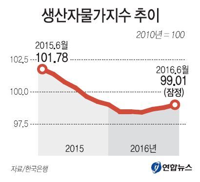 한국은행이 19일 발표한 ‘2016년 6월 생산자물가지수’를 보면 지난달 생산자물가지수(2010=100) 잠정치는 99.01로 5월(98.79)보다 0.2% 올랐다.