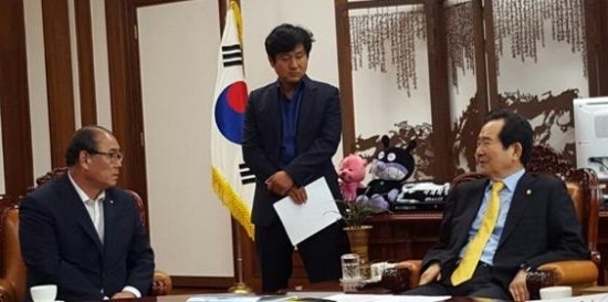 ▲ 무주군 황정수 군수(왼쪽)·유송열 군의회 의장 일행이 지난 20일 국회에서 정세균 의장과 환담을 하고 있다.