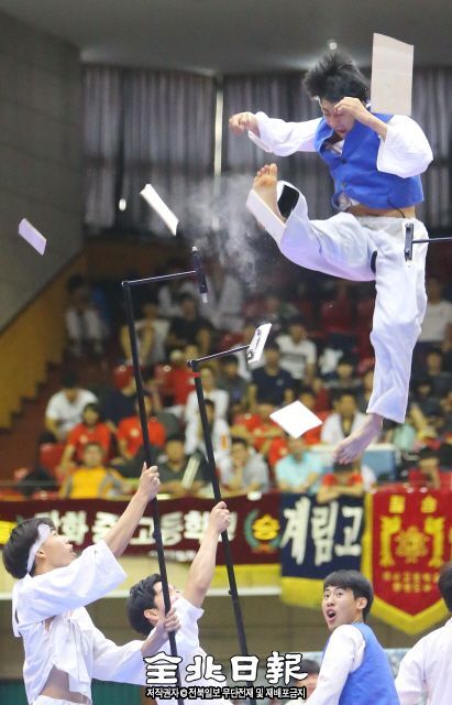 ▲ 제14회 우석대학교 총장기 전국 태권도대회 개막식이 열린 25일 우석대학교 체육관에서 태권도 시범단이 화려한 공연이 선보이고 있다. 박형민 기자