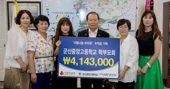 군산중앙고등학교 학부모회(회장 문정은)은 2일 바자회를 통해 마련한 수익금 414만3000원을 군산시에 전달했다.