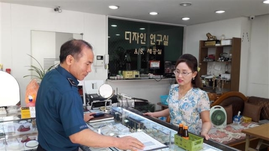 ▲ 김제경찰서 범죄예방 진단팀 직원이 금은방을 찾아 방범시설을 점검하고 있다.