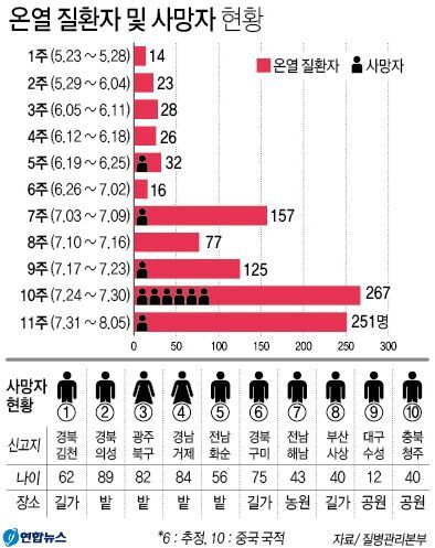 이 중 올해 첫 온열질환 사망자인 A(62)씨를 제외한 나머지 4명은 70대 이상이다. 60대 이상 사망자 중 3명은 밭일을 하다가 온열질환에 걸려 결국 숨을 거뒀다. 나머지 2명의 발견 장소는 길가다. 연합뉴스