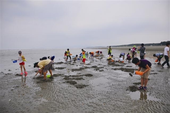 ▲ 학생들이 장호갯벌에서 갯벌생태체험교육의 일환으로 조개를 잡고 있다.