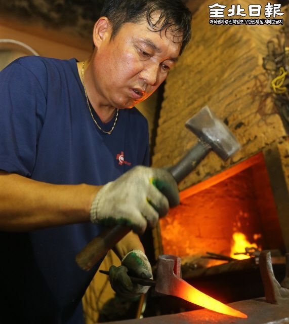 9일 오전 10시께 찾아간 전주시 완산구 용머리 고개의 광명 대장간에서는 문화재청 철물기능인 2736호인 김창기 씨가 땀을 뻘뻘 흘리며 열심히 쇠를 달구고 있었다.