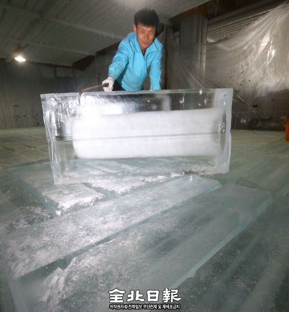 바깥 기온이 34도를 향해 치솟던 이 날 오전 11시 30분께 찾은 전주시 덕진구 송천동 수산시장 내 얼음 공장에서는 큼지막한 얼음을 전기톱으로 자르는 작업이 한창이었다.