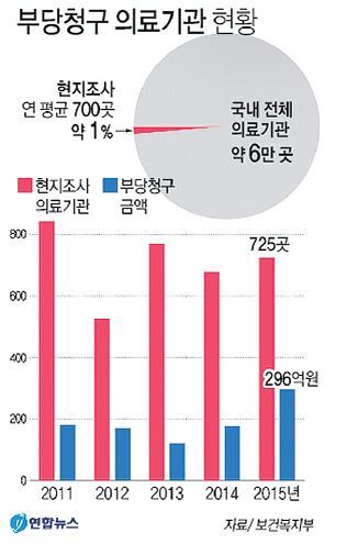 10일 보건복지부의 2011~2015년 부당청구 의료기관 현지조사 실시현황 및 제재 현황 자료를 보면, 현지조사 의료기관은 2011년 842곳, 2012년 526곳, 2013년 770곳, 2014년 679곳, 2015년 725곳 등 연간 평균 700곳 수준에 불과하다. 국내 전체 의료기관 약 6만 곳 중에서 매년 약 1%만을 대상으로 현지조사를 하고 있을 뿐이다. 건강보험 당국이 현지조사로 적발한 부당청구 금액도 2011년 181억원, 2012년 170억원, 2013년 121억원, 2014년 177억원, 2015년 296억원 등에 그쳤다. 연합뉴스