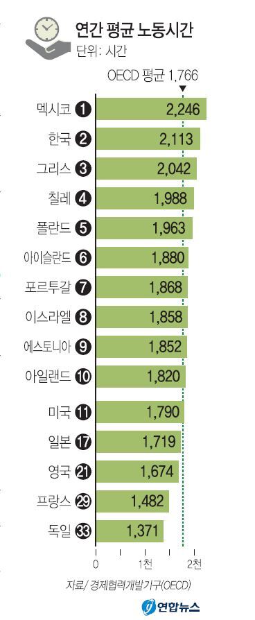 이를 하루 법정 노동시간 8시간으로 나누면 한국 취업자는 OECD 평균보다 43일 더 일한 셈이 된다. 한 달 평균 22일 일한다고 가정했을 때 OECD 평균보다 두 달 더일한 꼴이다.