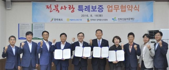 전북도, 전북신용보증재단, 농협은행 전북본부, 전북경제통상진흥원은 16일 전북신보재단에서 ‘전북사랑 특례보증 지원사업 업무협약’을 체결하고 한 업체당 5000만원씩 대출금리를 우대하기로 했다.