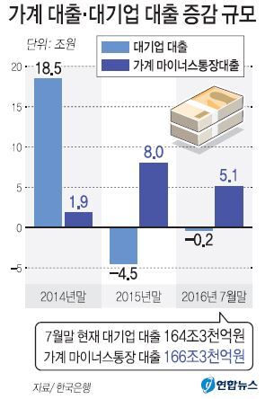 가계의 마이너스통장대출 등이 대기업 대출을 추월한 것은 지난 2013년 12월 이후 2년 7개월 만에 처음이다. 연합뉴스