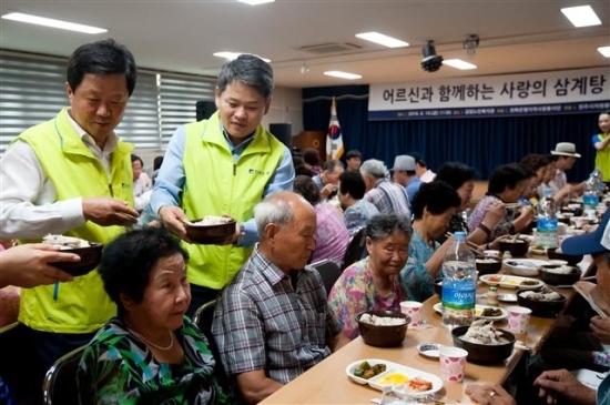 전북은행지역사랑봉사단(공동단장 임용택 은행장, 최강성 노조위원장)은 지난 19일 전주시 덕진구에 있는 금암노인복지관(관장 서양열)에서 ‘사랑의 삼계탕 나눔’ 봉사활동을 펼쳤다.