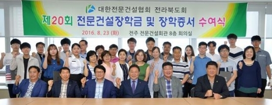 대한전문건설협회 전라북도회(회장 이광한)는 23일 전주 전문건설회관 8층 회의실에서 ‘제20회 전문건설 장학금 및 장학증서 수여식’을 갖고 2016년도 장학생으로 선발된 25명(고교생 12명, 대학생 13명)에게 모두 2260만원의 장학금을 전달했다.