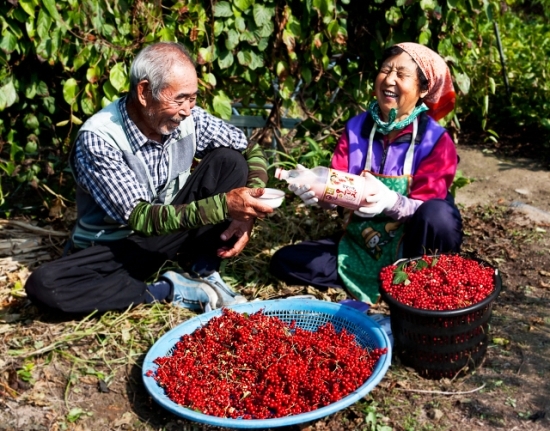 ▲ 지난해 문경 오미자를 첫 수확한 농민들이 오미자 음료를 마시며 쉬고 있다. 문경 오미자는 백두대간의 남한구간 정중앙인 문경 지역에서 생산되고 있다. 사진 제공=문경시