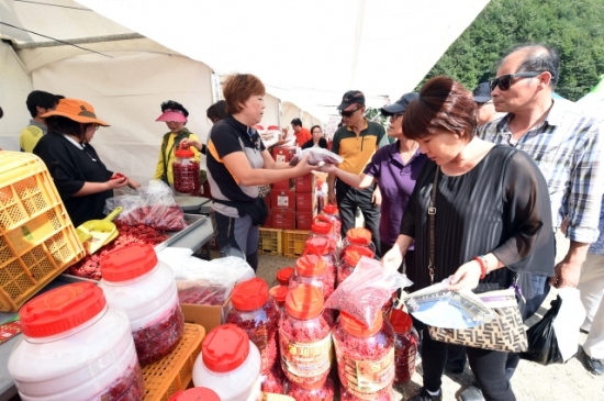 ▲ 지난해 문경 오미자 축제에 참가한 관람객들이 다양한 오미자 제품들을 둘러보고 있다. 사진 제공=문경시