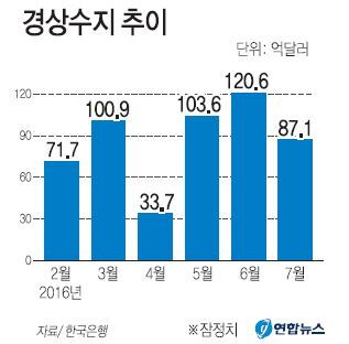 한국은행이 1일 발표한 ‘2016년 7월 국제수지(잠정)’를 보면 지난 7월 상품과 서비스 등을 포함한 경상수지 흑자는 87억1000만달러로 집계됐다. 이로써 경상수지는 2013년 3월 이후 53개월 연속 흑자를 내면서 최장 흑자 기록을 다시 썼다. 그러나 흑자 규모는 월간 최대 수준이었던 6월(120억6000만 달러)의 72% 수준으로 축소됐다. 지난 4월(33억7000만 달러) 이후 3개월 만에 가장 작은 수준이다. 7월 상품수지 흑자는 108억1000만 달러로 6월(127억1000만 달러)보다 많이 감소했다. 수출은 작년 7월보다 10.0% 줄어든 425억1000만 달러였고 수입은 15.1% 감소한 317억 달러였다.