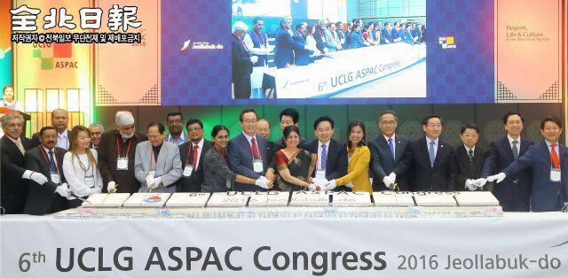 세계 32개국 680여명이 참석한 세계지방정부연합 아태지부 총회가 열린 5일 군산 새만금컨벤션센터에서 홍윤식 행자부장관과 원희룡 UCLA ASPAC회장, 버나디아 UCLA ASPAC 사무총장, 송하진 도지사 등 참석자들이 기념떡 커팅을 하고 있다.
