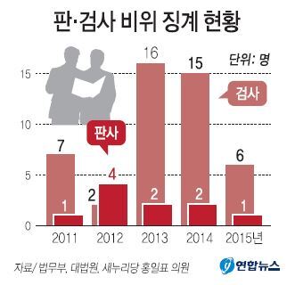 검사의 경우 2011년 7명, 2012년 2명이었다가 2013년 16명, 2014년 15명으로 급증했다. 지난해에도 6명이 징계를 받았다.