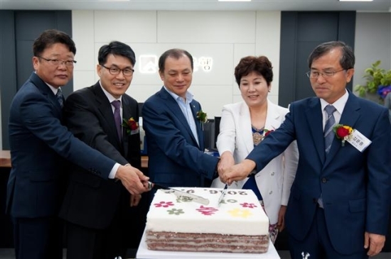 ▲ 7일 전북은행 혁신도시 지점 이전 행사에 참석한 임용택 전북은행장(가운데)과 조봉업 전주시 부시장(왼쪽 두번째) 등 관계자들이 축하 떡케이크을 자르고 있다.