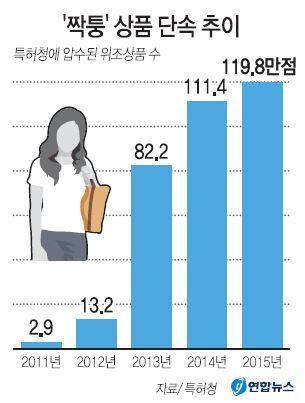 국회 산업통상자원위원회 소속 새누리당 이철우 의원은 8일 특허청이 제출한 ‘위조상품 단속 현황’을 분석한 결과, 짝퉁 명품 가방 등 압수된 물품은 2011년 2만8589점, 2012년 13만1599점, 2013년 82만2370건, 2014년 111만4192건, 2015년 329만4412건으로 급증했다. 5년 새 47배 늘어난 것이다.