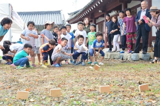 ▲ 순창군 순창읍 교성마을 순창향교에서 오는 12월 21일까지 전통놀이 현대화 체험 프로그램이 진행되는 가운데 체험에 참여한 어린이들이 비석치기를 하고 있다.
