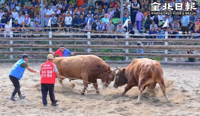 제11회 완주전국민속소싸움대회 결승전이 열린 12일 완주 화산면 화산생활체육공원에서 싸움소들이 박진감 넘치는 경기를 펼치고 있다.