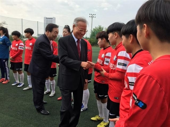 ▲ 도체육회 김광호, 최찬욱 부회장 등이 한별고를 찾아 체전을 대비해 훈련중인 선수들을 격려하고 있다.