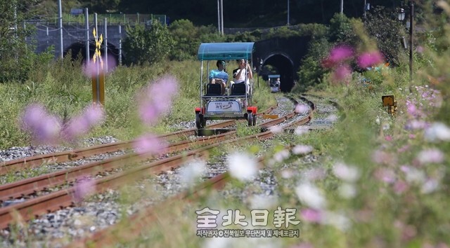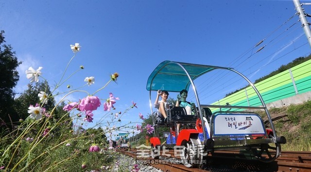 완연한 가을날씨를 보인 지난 24일 전주를 찾은 관광객들이 아중역 폐철도 구간에 설치된 레일바이크를 타며 철로를 달리고 있다.