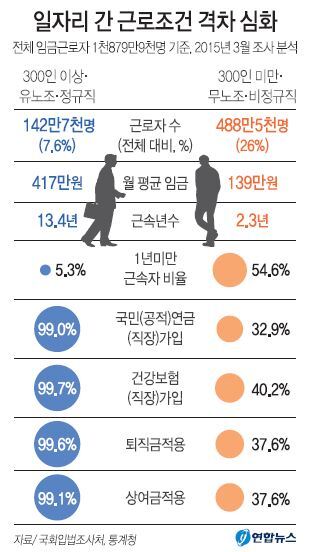 국회입법조사처 김준 환경노동팀장은 통계청의 ‘2015년 3월 경제활동인구조사 근로형태별 부가조사’ 마이크로데이터를 이용해 분석한 결과 이같이 나타났다고 26일 밝혔다. 연합뉴스
