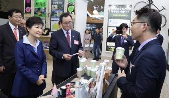 ▲ 청년 창업 설명 듣는 박 대통령 박근혜 대통령이 28일 경기도 고양시 킨텍스에서 열린 2016 지역희망 박람회 전라북도 부스에서 청년창업자의 설명을 듣고 있다. 연합뉴스