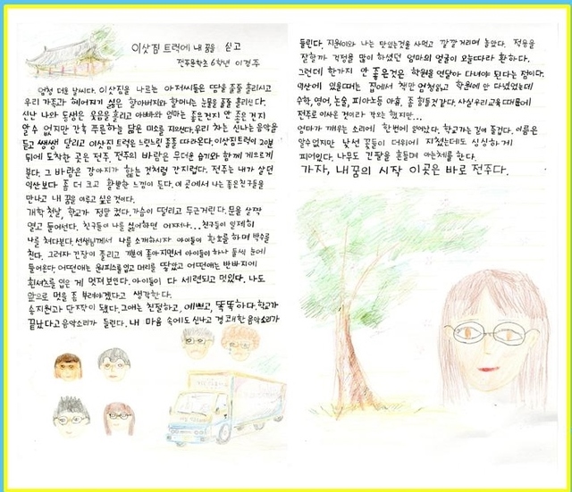 이양은 “할아버지, 할머니와 함께 살던 익산을 떠나는 게 아쉽기도 하고 전주에서의 생활이 기대도 되는 특별한 날을 글로 썼다”면서 “심사위원분들이 제 맘을 알아줘서 정말 고맙고, 처음 나간 글쓰기 대회인데 상을 받게 돼 기분이 좋았다”고 말했다.