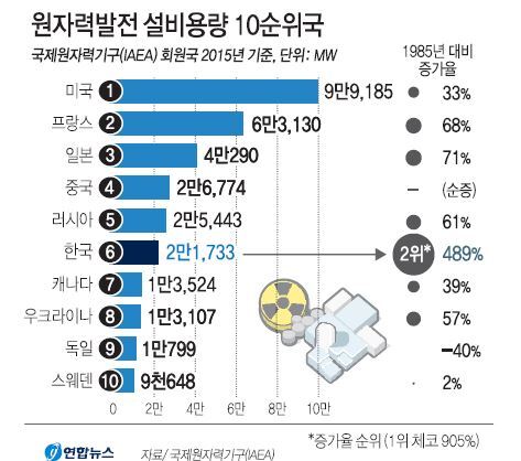6일 IAEA가 발간한 ‘세계의 원자로 2016년 판’ 보고서에 따르면 작년 말 기준 국가별 원자력발전 설비용량에서 한국은 2만1733㎿로 IAEA 회원국 중 여섯 번째로컸다. 연합뉴스