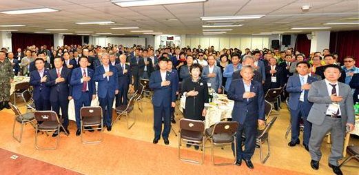 ▲ 지난 8일 고창군청 회의실에서 열린 ‘고창군 애향의 밤’행사에서 참석자들이 국민의례를 하고 있다.