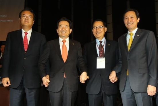 한편, 새누리당 정진석·더불어민주당 우상호·국민의당 박지원 등 3당 원내대표도 이번 포럼에 참석해 정 의장과 같은 테이블에서 오찬을 했다. 최근 김재수 농림축산식품부 장관 해임건의안 처리에 따른 국회파행이 봉합된 이후 3명의 원내대표의 처음 만나는 자리란 점에서 관심을 끌었으나 이들은 ‘국회의장 중립법’ 발의 계획과 새누리당의 정 의장 형사고발 취하 등 현안에 대해선 별다른 얘기를 나누지 않은 것으로 전해졌다.