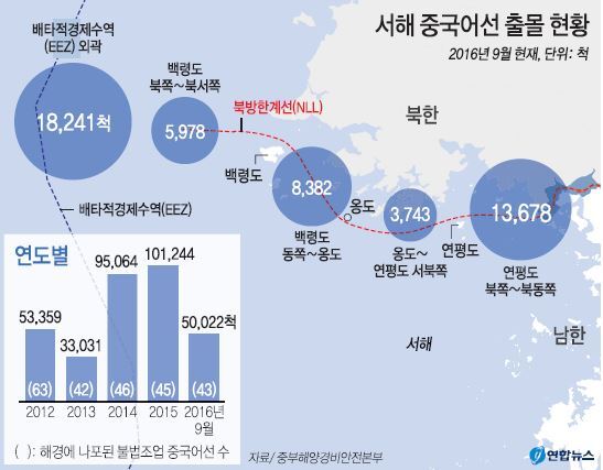 이는 해경이 백령도 북쪽~북서쪽, 백령도 동쪽~옹도, 연평 북쪽~북동쪽 등 서해 NLL 인근 4개 구역과 EEZ 주변에 출몰한 중국어선을 모두 합한 수치다. 올해는 9월까지 5만22척의 중국어선이 서해 북단 해상에 출몰한 것으로 확인돼 지난해 전체 10만2244척보다는 감소했다.
