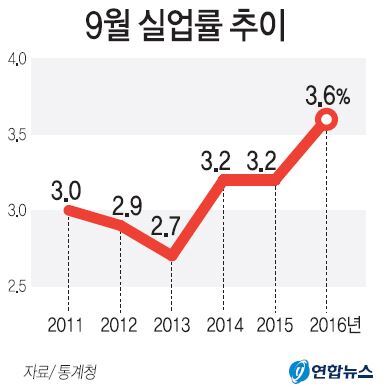 실업률은 지난해 같은 달보다 0.4%p 상승한 3.6%를 기록했다. 이는 2005년 9월(3.6%) 이후 같은 달 기준으로 가장 높은 수준이다.