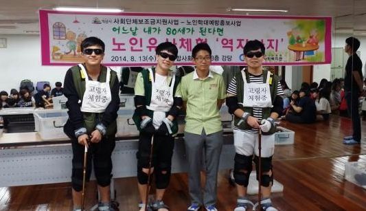 ▲ 2014년 8월 13일 익산 부송종합복지관에서 실시한 노인유사체험.