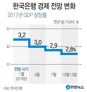 한국은행은 13일 금융통화위원회 직후 내년도 경제성장률 전망치를 2.9%에서 2.8%로 0.1% 포인트 내린다고 발표했다.