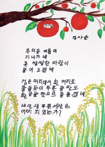 “나는 이름을 쓸 줄 몰랐다 / 이름을 쓰려고 / 연필을 잡으면 / 손은 덜덜덜 / 가슴이 쿵쾅 쿵쾅 / 이름을 못 쓰니 창피했다 / 한글 공부를 하고 / 이제는 이름을 쓸 수 있다 / ‘박 순 자’ / 내 이름 석 자만 봐도 / 기분이 좋다”