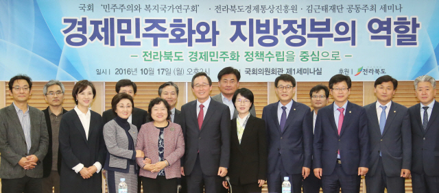 17일 서울 국회 의원회관에서 전북경제통상진흥원과 국회 민주주의와 복지국가 연구회, 김근태 재단이 공동으로 주관한 ‘경제민주화와 지방정부의 역할’ 정책세미나에 송하진 도지사와 인재근 국회의원, 김광수, 안호영 의원, 최상명 우석대 교수 겸 김근태 민주주의연구소장 및 토론, 발제자들이 기념촬영을 하고 있다. 사진제공=전북도청