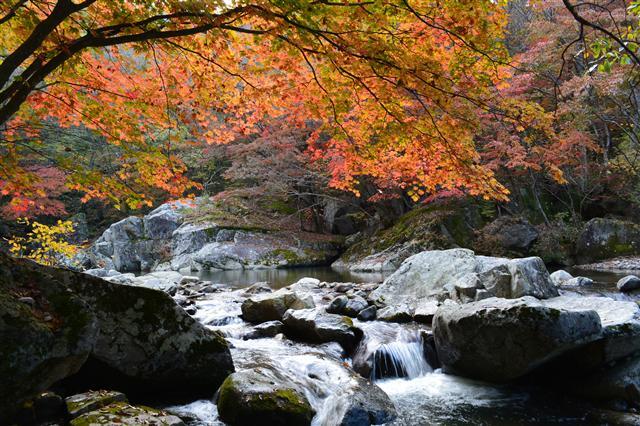 덕유산국립공원(소장 홍대의) 구천동 계곡길이 20일 현재, 단풍과 어우러져 마치 한 폭의 가을 수채화를 연상케 한다.