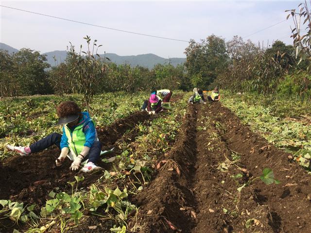 이날 행사에선 완창마을 이기춘씨(75) 밭에서 고구마와 감 수확작업을 도왔다.