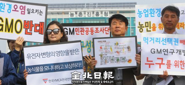 한국YMCA 전국연맹과 전주YMCA 회원들이 20일 농촌진흥청 앞에서 기자회견을 갖고 GMO 작물 연구개발을 중단 할 것을 촉구했다.