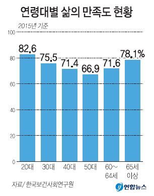 23일 한국보건사회연구원이 지난해 발간한 ‘2015 보건복지정책 수요조사 및 분석’ 보고서를 보면 20대 이후 삶의 만족도는 나이가 들수록 낮아지다가 50대에 바닥을 치고 다시 올라가는 ‘U자형’변화를 보였다.