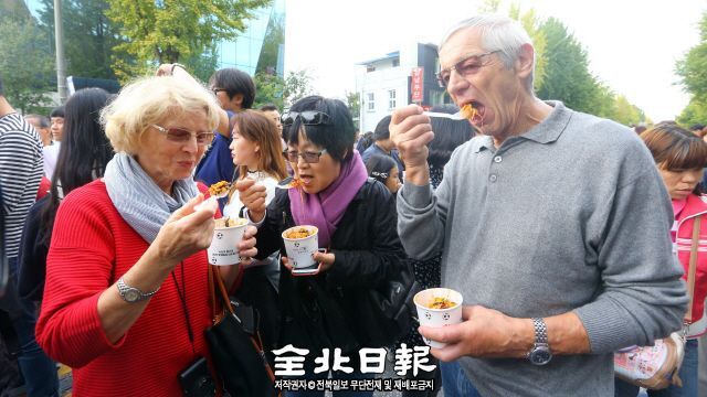 전주시 33개동 주민들이 참여하는 전주비빔밥축제 비빔퍼포먼스가 열린 지난 22일 전주 팔달로에서 외국인 관광객들이 비빔밥을 맛보며 축제를 즐기고 있다.