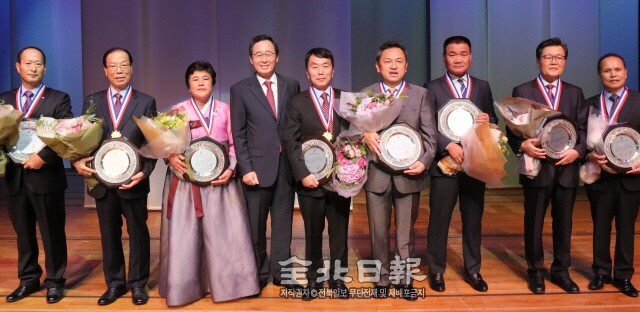 왼쪽부터 근로대상 김창종 한국농어촌공사 차장, 나눔대상 황의옥 약사, 효행대상 손미향 씨, 농림수산대상 이정 정이수산영농어조합 대표 ,학술언론분야대상 백성일 전북일보 상무이사, 체육대상 김대은 전북축구협회장, 문화예술대상 이동희 작가,경제대상 김종학 참바다영농조합 대표. 안봉주 기자