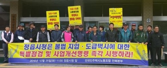 전국민주택시노조 전북본부는 25일 정읍시청앞에서 기자회견을 갖고, 정읍시에 불법 지입·도급 택시 엄중 처벌을 촉구했다.