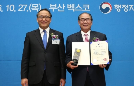 ▲ 지난 27일 시상식에서 홍윤식 행정자치부장관과 황정수 무주군수가 기념촬영을 하고 있다.