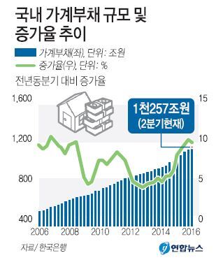 또 내년 말에는 9.8% 증가해 1460조원까지 늘어날 것으로 봤다. 이 경우 연간소득 대비 가계부채 비율은 약 159%에 이를 전망이다. 연합뉴스