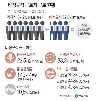 경력이나 업종 등 모든 조건이 같아도 임금 차이는 10% 이상 났고 퇴직급여·상여금·시간외수당·유급휴가 등을 받는 비중도 정규직에 비해 30∼40%포인트 가량 낮았다. 연합뉴스