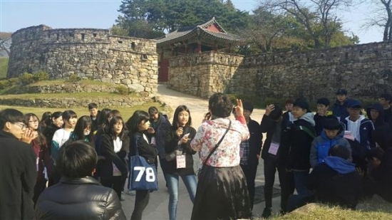 ▲ 고창읍성을 방문한 서울·고창 ‘청소년 팜 스테이 책마을 출판 캠프’ 참가자들이 문화해설사로부터 설명을 듣고 있다. 사진제공=고창군