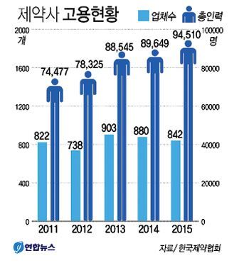 7일 한국제약협회에 따르면 제약사에 근무하는 인력은 2011년 822개 업체, 7만4000명이었으나 2015년에는 842개 업체, 9만4500명으로 나타났다. 4년 만에 근무 인력이 27%가량 증가한 셈이다. 같은 기간 업체 수는 2% 늘어나는 데 그쳐 절대적인 고용이 많이 늘어난 것으로 풀이된다. 연합뉴스